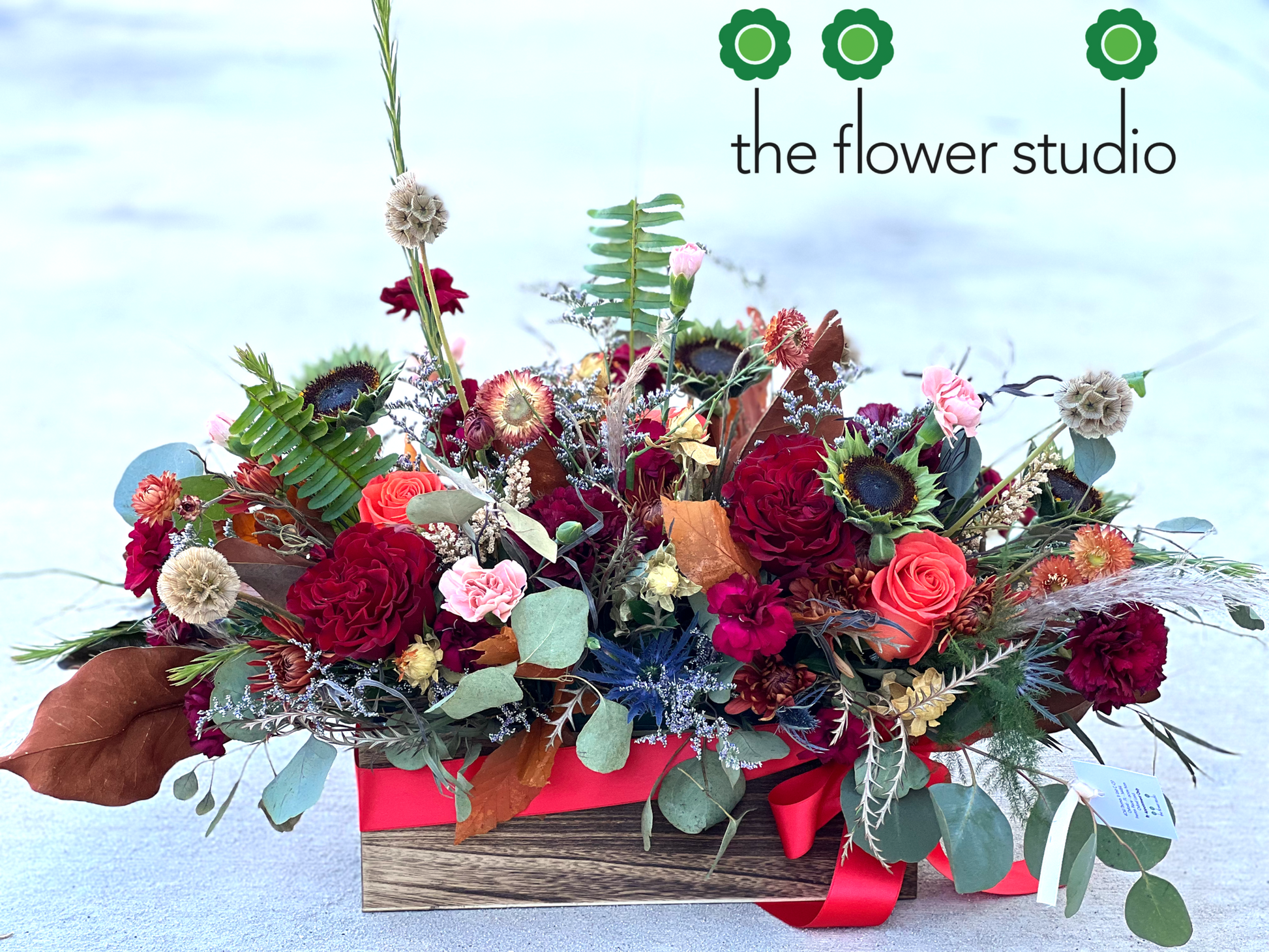 Overflowing with lush burgundy and marsala blooms, accented by fragrant eucalyptus, dried botanicals, and unexpected pops of deep blue and vibrant red, this design is bold yet refined. Its layered textures and rich tones make it an unforgettable centerpiece for autumn gatherings, seasonal gifts, or simply adding a touch of cozy elegance to your home.