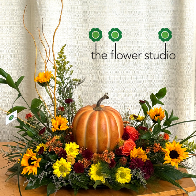 The Autumn Radiance Centerpiece combines a realistic faux pumpkin with fresh flowers, creating a striking table arrangement that embodies the essence of fall.