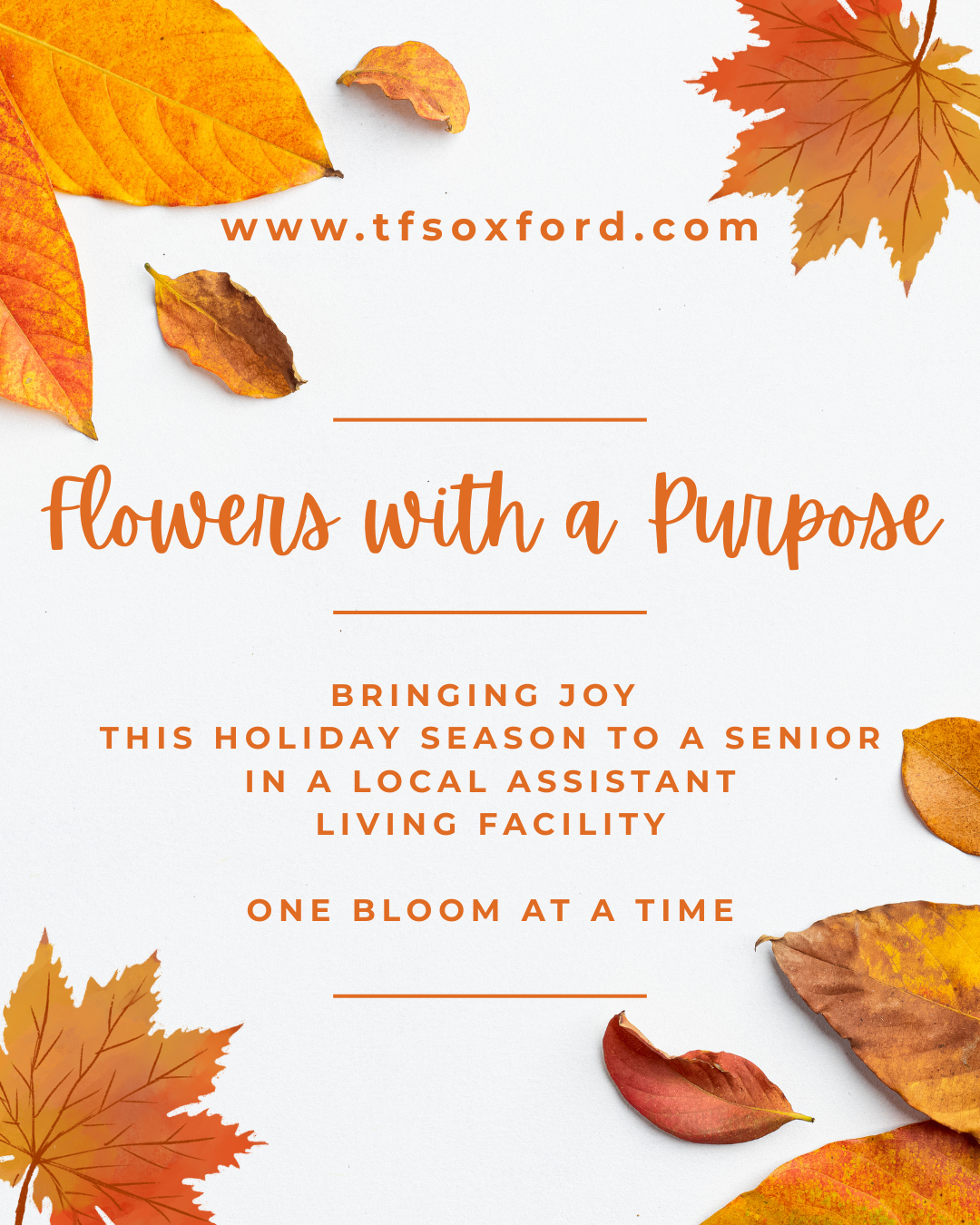 When you purchase a Flowers with a Purpose arrangement, you are sending love, kindness, and seasonal beauty to a Senior in a local assisted living who may not have family nearby during the holidays.