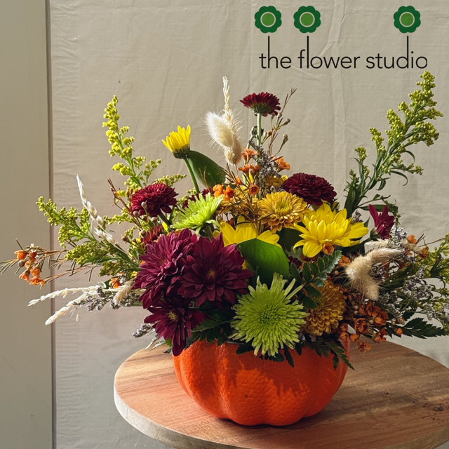 Each arrangement is uniquely designed, so pumpkin size and flower varieties may vary slightly—just like nature intended.