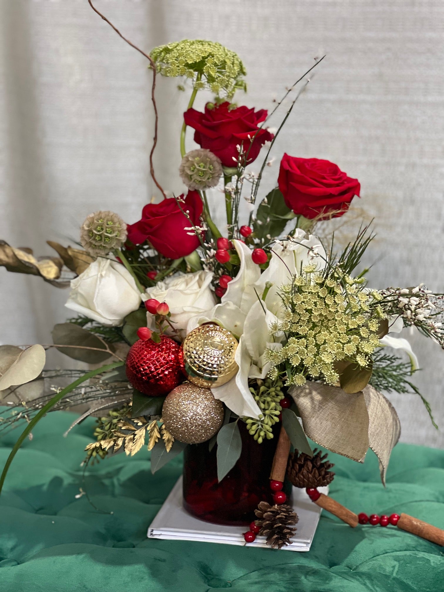 Our Holly Jolly Holiday Special exudes opulence with a red glass vessel, displaying a lush arrangement of upscale flowers, including lilies, roses, and queen Anne lace.