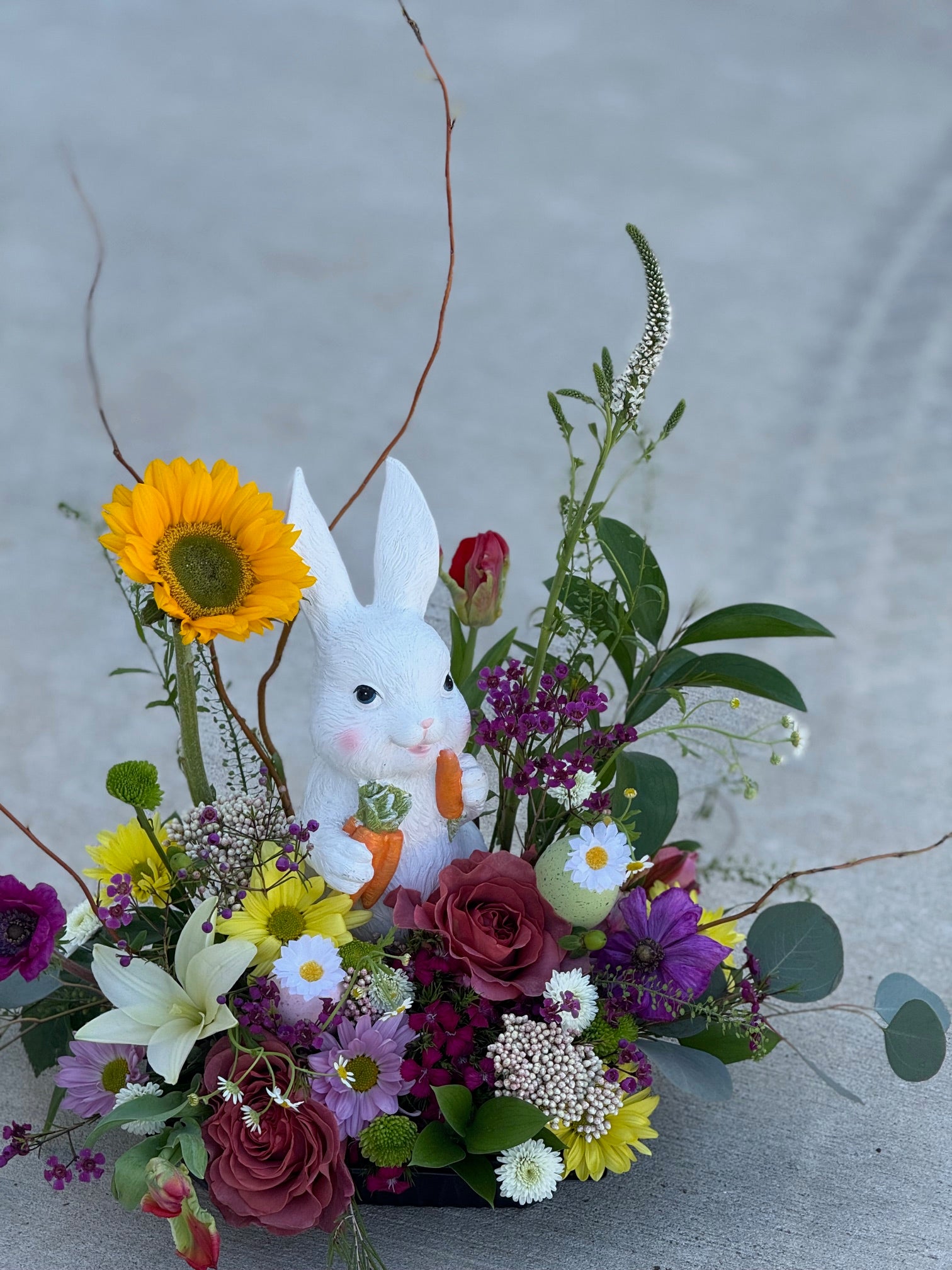 A gorgeous little bunny surrounded by fresh flowers, Easter eggs and faux daisies.