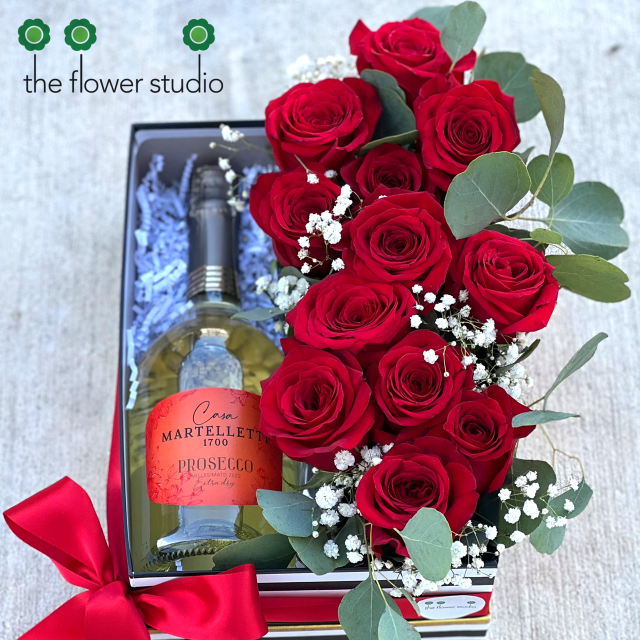 This trendy paper box is filled with vibrant red roses and a bottle of sparkling prosecco, making it the perfect gift for those 21 and over.