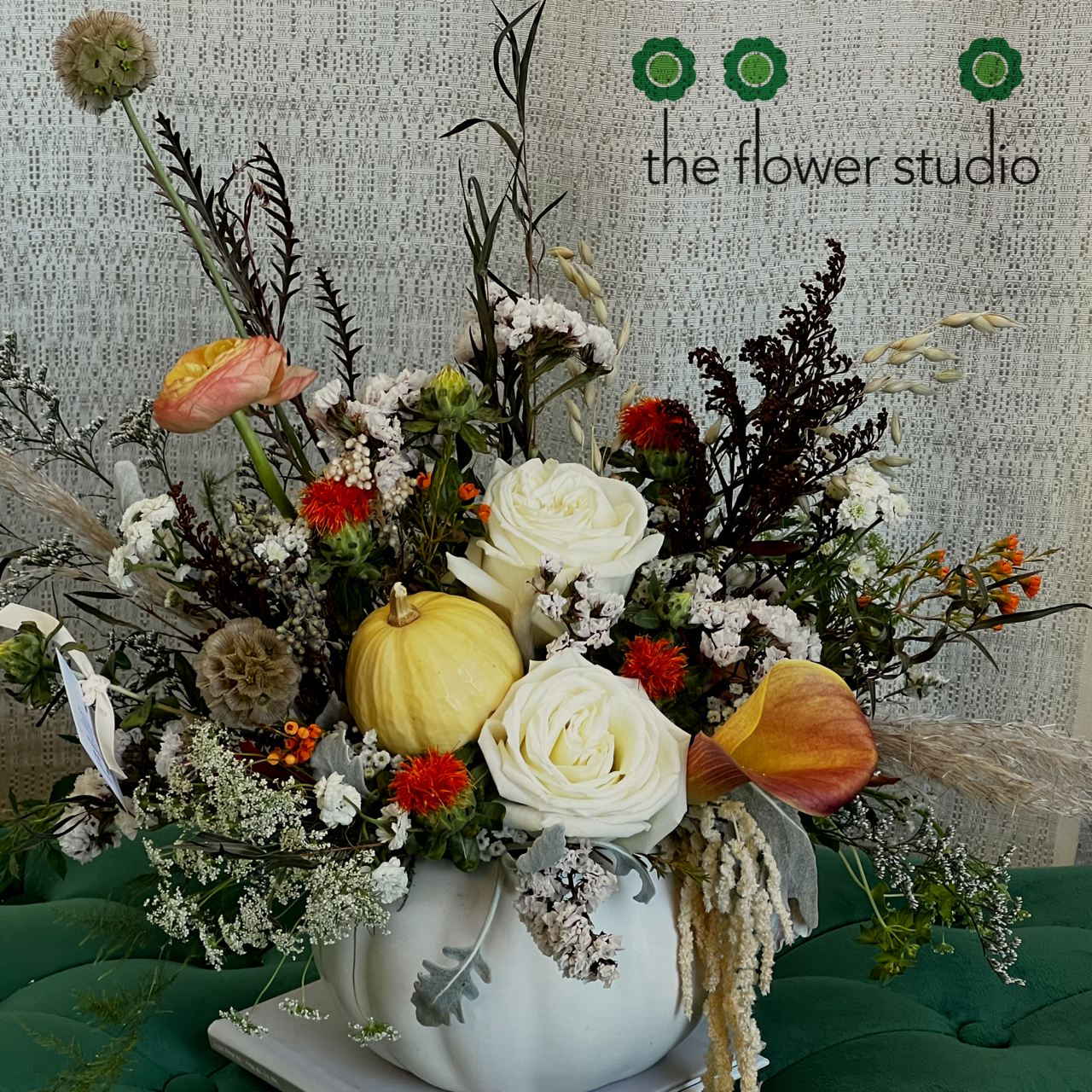 Celebrate the season with our Serenity Pumpkin, a modern white ceramic pumpkin that doubles as a keepsake for years to come. Designed exclusively at The Flower Studio Oxford, this elegant piece is more than just an arrangement: it’s a statement of style and versatility.