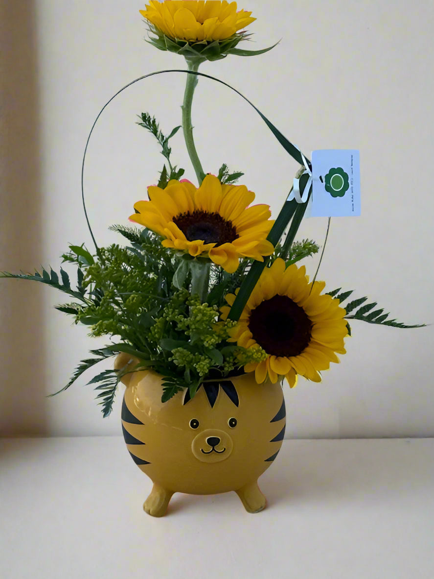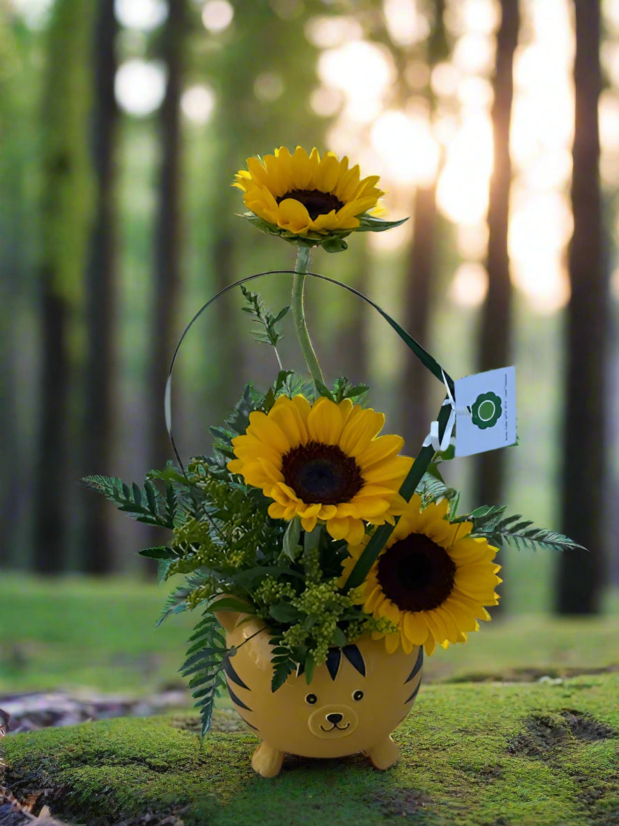 This playful arrangement features vibrant sunflowers that radiate warmth and joy, perfectly perched in our little tiger friend who's ready to pounce right into your heart.