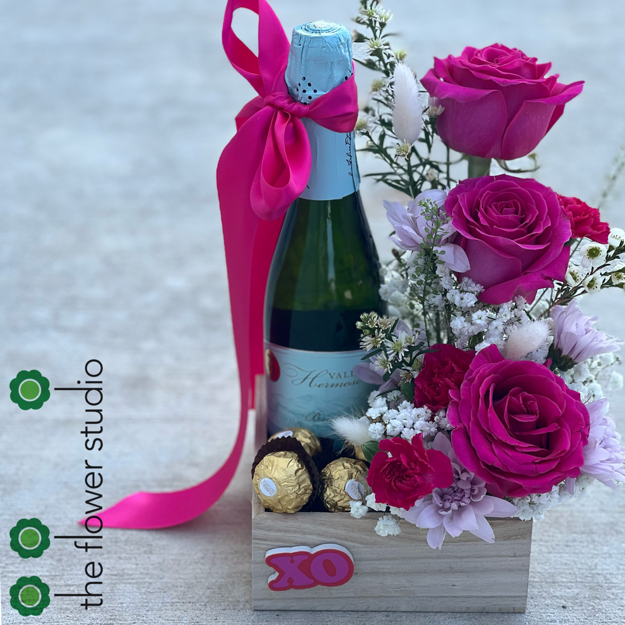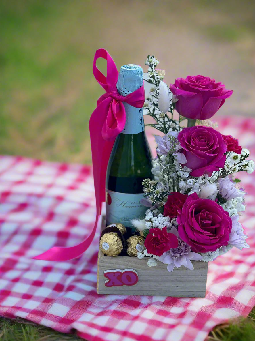Spoil your loved one with XO - a unique gift box filled with Valle Hermoso Brut wine, chocolate, and flowers.